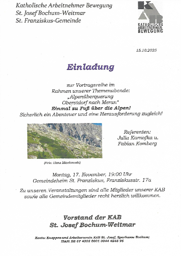 | Veranstalter: | Gemeinde St. Franziskus | KAB (St. Josef) |